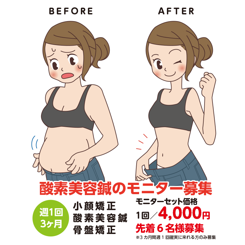 3カ月間週1回4,000円で体験できます。「小顔矯正、酸素美容鍼、骨盤矯正」を体験(約1時間)してみませんか?