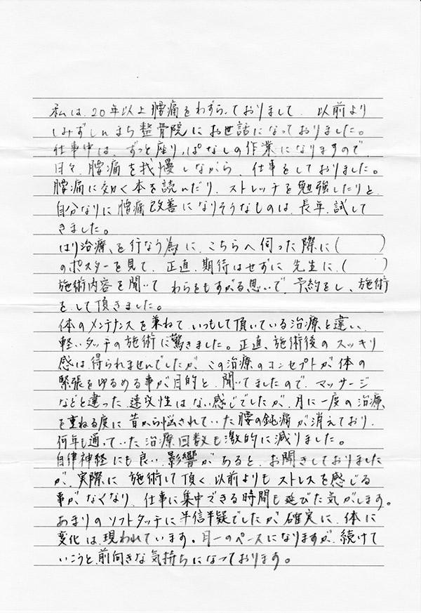 自律神経にも良い影響があるとお聞きしておりましたが、実際に施術して頂く以前よりもストレスを感じることがなくなり、仕事に集中できる時間も延びた気がします。あまりのソフトタッチに半信半疑でしたが確実に体に変化は現れています。月一のペースになりますが、続けていこうと前向きな気持ちになっております。