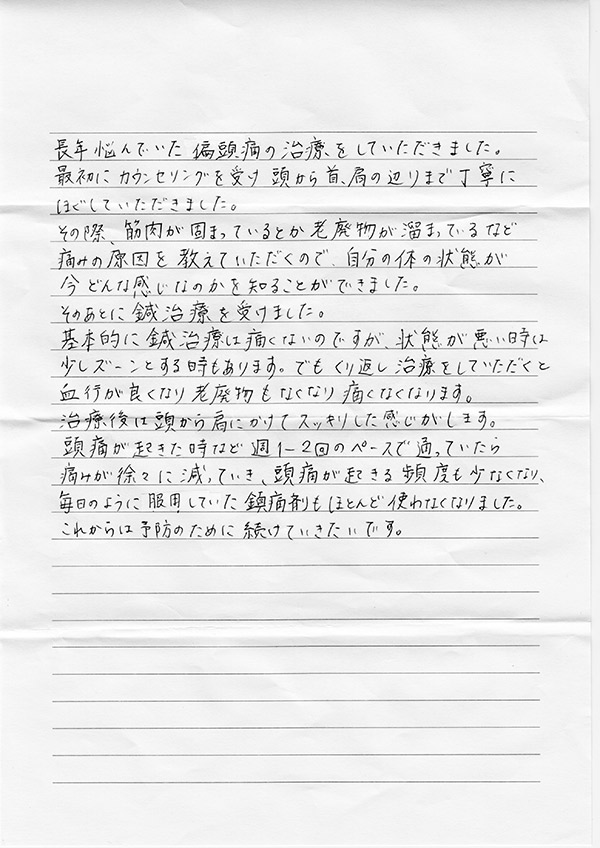 治療後は、頭から肩にかけてスッキリした感じがします。頭痛が起きた時など週1〜2回のペースで通っていたから、痛みが徐々に減っていき、頭痛が起きる頻度も少なくなり、毎日のように服用していた鎮痛剤もほとんど使わなくなりました。これからは予防のために続けていきたいです。