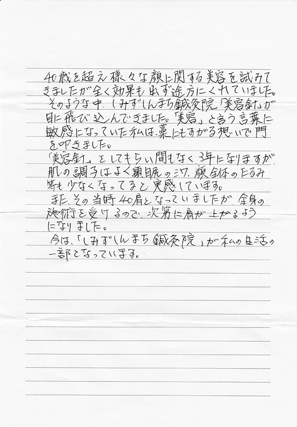 40歳を超え、様々な顔に関する美容を試みてきましたが、全く効果も出ず途方に暮れていました。そのような中、しみずしんまち鍼灸院「美容鍼」が目に飛び込んできました。「美容」と言う言葉に敏感になっていた私は、藁にもすがる思いで門を叩きました。