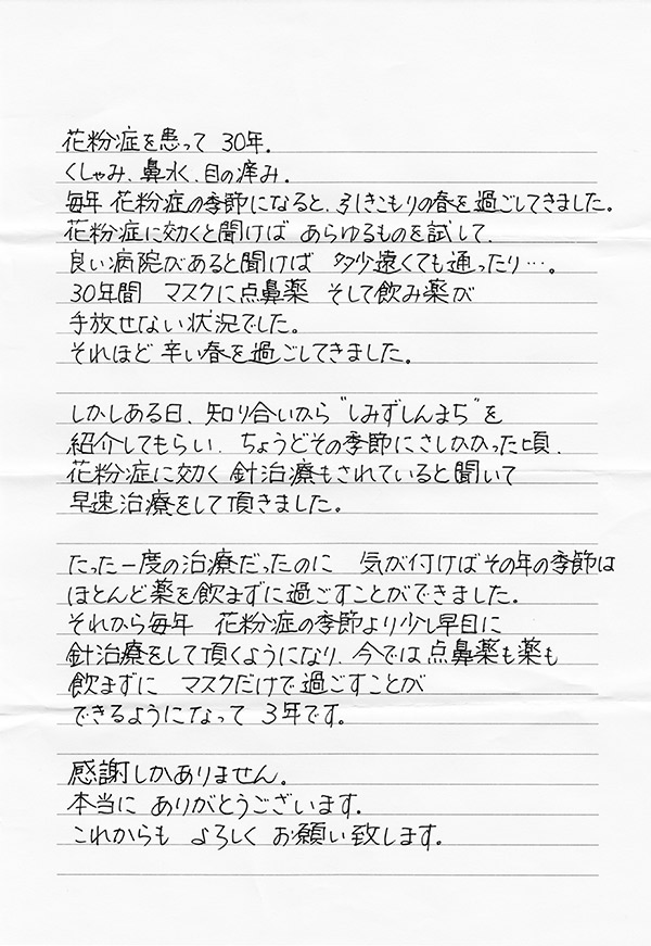 それから毎年、花粉症の季節より少し早めに鍼治療をしていただくようになり、今では点鼻薬も薬も飲まずに、マスクだけで過ごすことができるようになって3年です。